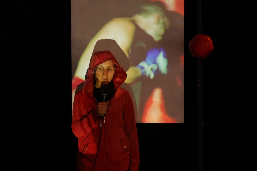 Sur une scène évoquant un ring, un musicien et une comédienne donnent libre cours à leur imagination en un poème sonore fait de coups, de souffles, de textes et de sons cependant que sont projetées sur écran les photos d’un boxeur dans sa préparation d’avant le combat