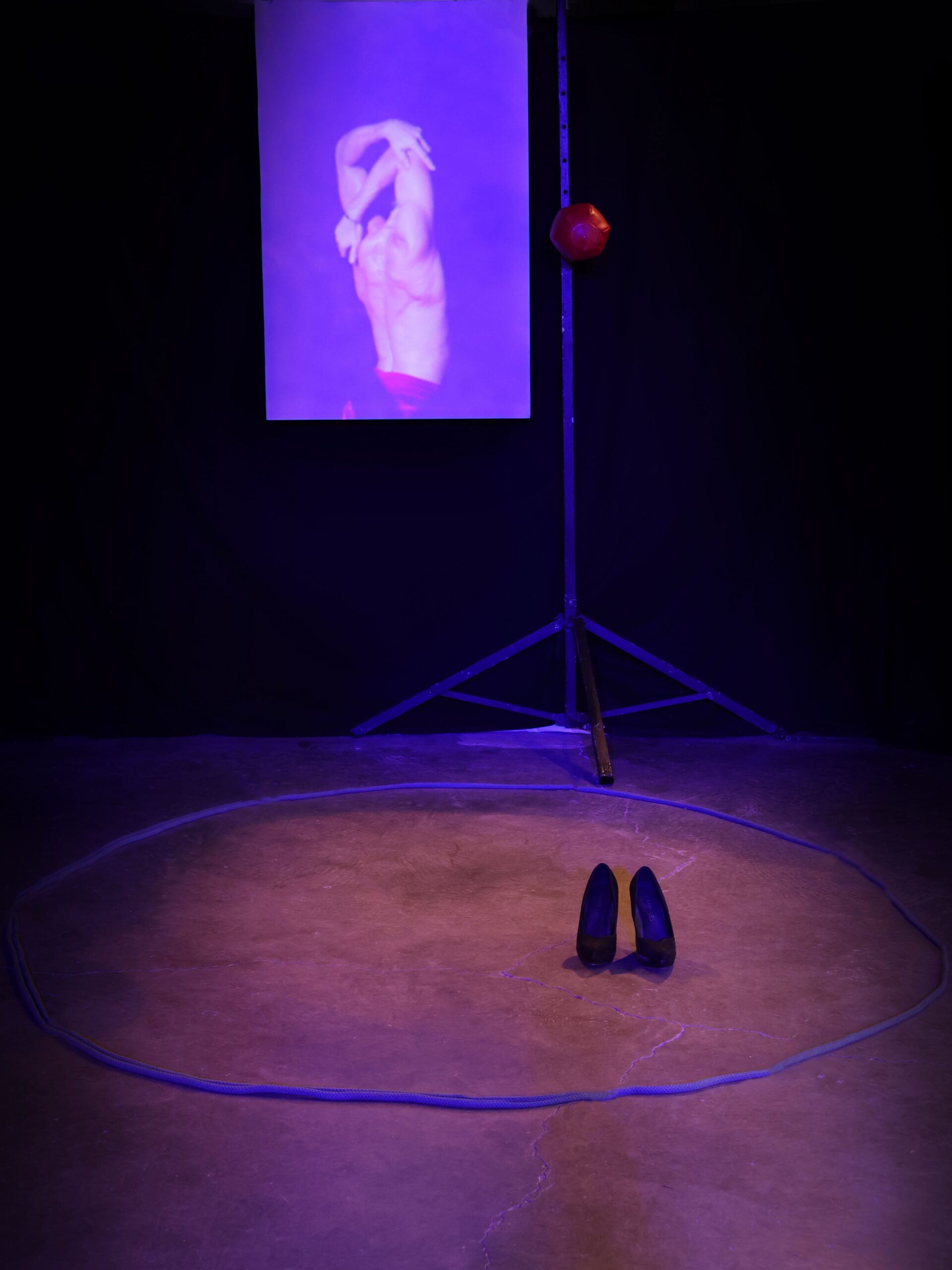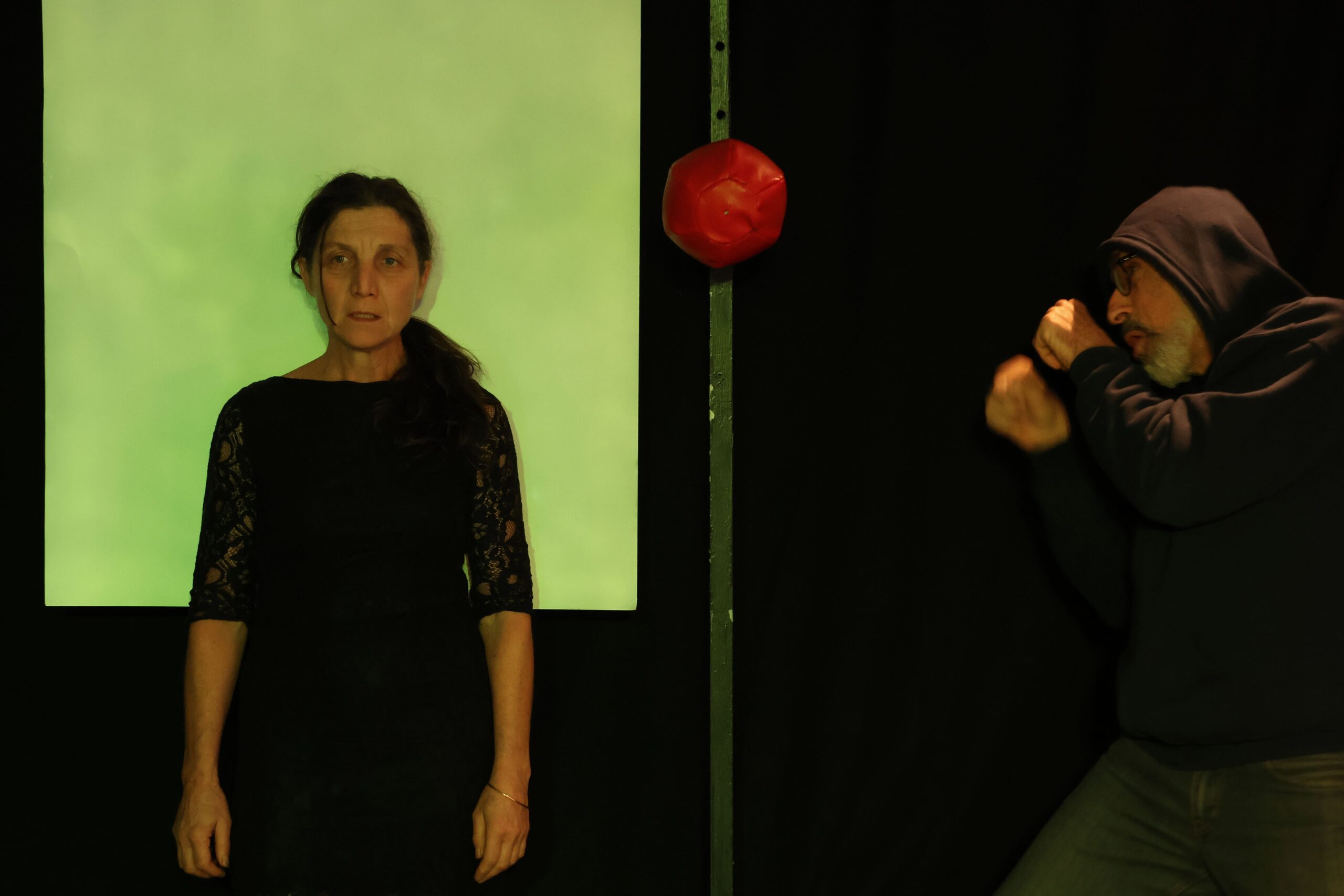 Sur une scène évoquant un ring, un musicien et une comédienne donnent libre cours à leur imagination en un poème sonore fait de coups, de souffles, de textes et de sons cependant que sont projetées sur écran les photos d’un boxeur dans sa préparation d’avant le combat
